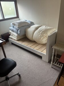 話はそれてしまいましたが、作業に戻りたいと思います。まずは、皆で協力しながら家具の搬出作業をしていきます。家具だけで30点程ありました。皆でおろしましたら、少しでもゴミ代を減らすため壊していきます。バールやインパクトで家具をどんどん壊していきます。途中からは壊す係と家具を下まで運ぶ係で別れて作業し、私は今回運ぶ係で良い汗を流させて頂きました。(笑)