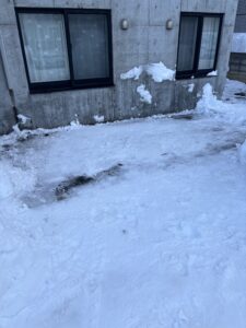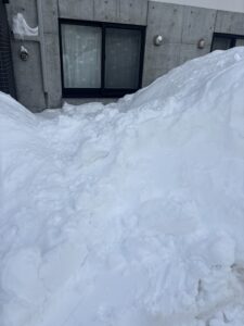 雪の高さは高い所ですと180㎝ぐらい積もっていました。スコップで削りながら、どんどん運んでいきます。二人で2時間程で完了なりました。終わった後はこんな感じです。
